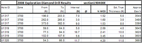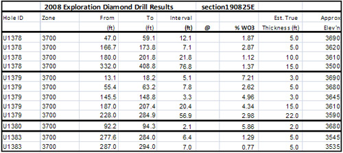 Section 190825 was drilled at an orientation 30 degrees west of engineering section (210 degrees) to intersect ore perpendicular to strike. Due to location of the drill cut out, drilling was often sub parallel to dip -- hence the true thickness is often considerably less than the reported intersection. This section is approximately 320 feet east of the geological cross section reported in the June 3rd, 2008 press release.