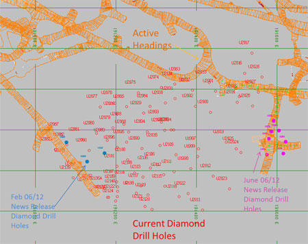 Diamond Drilling was implemented to fill 450 ft. gap between high grade intercepts in drill holes U1943, U1936, and U1937, discussed in the NTC February 6th, 2012 news release, and holes U1978 to U1985, discussed in the NTC June 6th, 2012 news release. A total of 87 Diamond Drill Holes amounting to 25,000 ft. of drilling were completed. Many of the holes intersected one to three zones of mineralization. This recent phase of drilling verifies the continuity of the mineralization within the Amber Zone and the Central Flats over an area with an approximate strike length of 600 ft. and an approximate down dip length of 650 ft. In addition it opens up 800 ft. of strike length of potential mineralization to the east. Drilling is now commencing in the area of "Amber Zone East" to test the continuity of two areas. Drifting toward the Amber Zone West has commenced from 4 headings within the current mine workings.