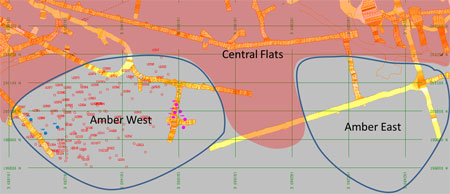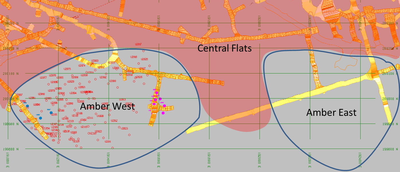 Plan View of Future Drilling in Eastern portion of Amber Zone Relative to Western portion of Amber Zone (Previously defined Central Flats is shown in pink)